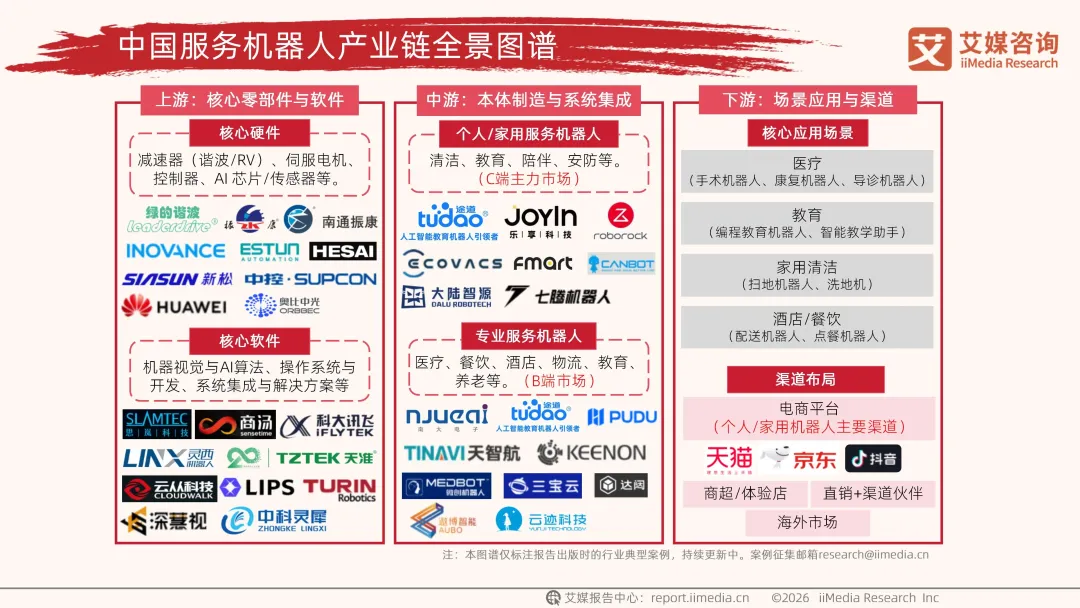 iiMedia Research(艾媒咨询)数据显示,2025年中国服务型机器人行业市场规模达1850.1亿元,同比增长41.8%;扫地机器人市场规模157亿元,同比增长7.5%;教育机器人市场规模66.7亿元,同比增长3.6%。
