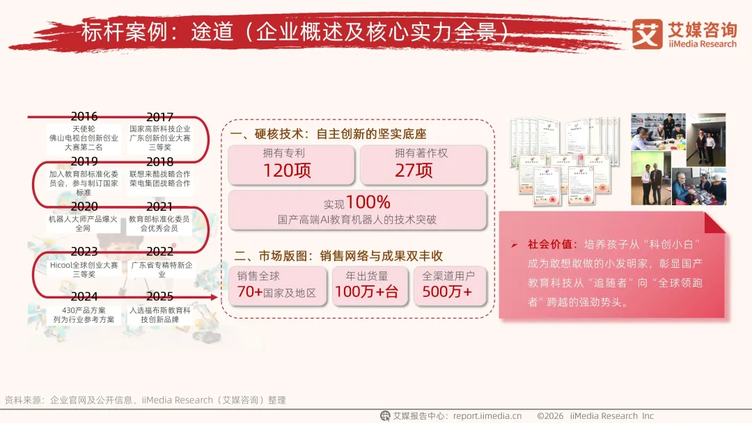 途道在机器人领域形成“玩-学-考-竞”四层级市场布局,覆盖大众消费、教育场景、专业考级及赛事竞技全领域。大众消费层,作为最早通过STEAM益智玩具认证的品牌,其产品已触达超70个国家,累计突破100万用户,实现全球化大众市场渗透;教育场景层,深度参与机器人与信息科学课本编制,跻身基础教育核心教具供应商阵列;专业考级层,主导考级标准制定,在行业标准化与考级服务领域树立权威;赛事竞技层,凭借多项赛事冠军,筑牢专业竞技领域的产品与成绩壁垒。