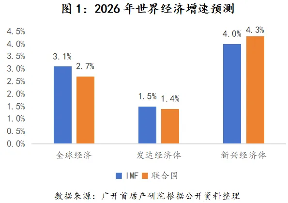 在地缘冲突、贸易保护主义和“对等关税”的影响下,2026年世界经济增长总体放缓。IMF、OECD、联合国等预测,2026年全球经济增长约2.7%-3.1%,较2025年小幅回落。新兴经济体继续成为生力军。尤其是中国、印度、越南等亚洲经济体表现更为亮眼,对世界经济的贡献将持续增强。2026年东亚、南亚和非洲经济增速分别预计为4.4%、5.6%和4.0%。发达经济体增速则普遍较为低迷。美国在AI资本开支与减税政策支撑下,增速约为1.8%-2.2%;欧元区受制于地缘政治不确定性、能源成本与人口老龄化等因素,增速为0.9%-1.2%;日本经济则因消费和投资放缓增速预计为0.7%-0.9%。美国消费市场和劳动力市场趋冷弱化增长动能。2025年12月美国制造业指数降至47.9,为2024年10月以来最低;美国领先经济指数(LEI)连续第10个月环比下降;消费者信心指数连续第5个月走低;2025年12月非农就业人数仅增加5万人,远低于预期的7万人,一些机构预测2026年底美国失业率或升至4.7%以上,接近触发“萨姆规则”的衰退预警阈值。