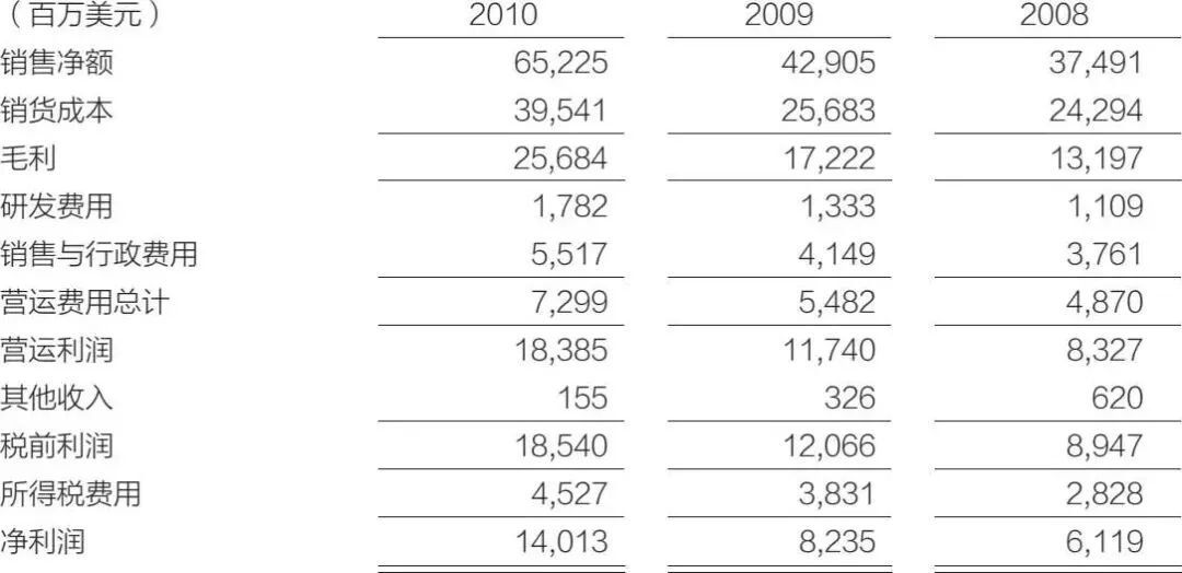 苹果公司利润表(译自苹果公司发布的2010年财务年报)