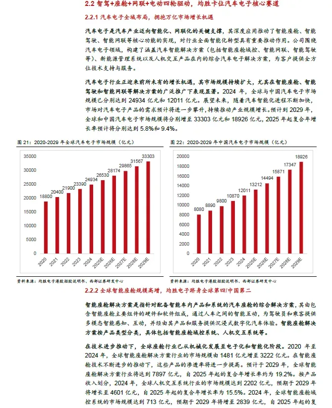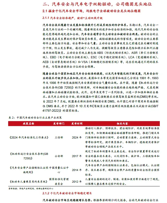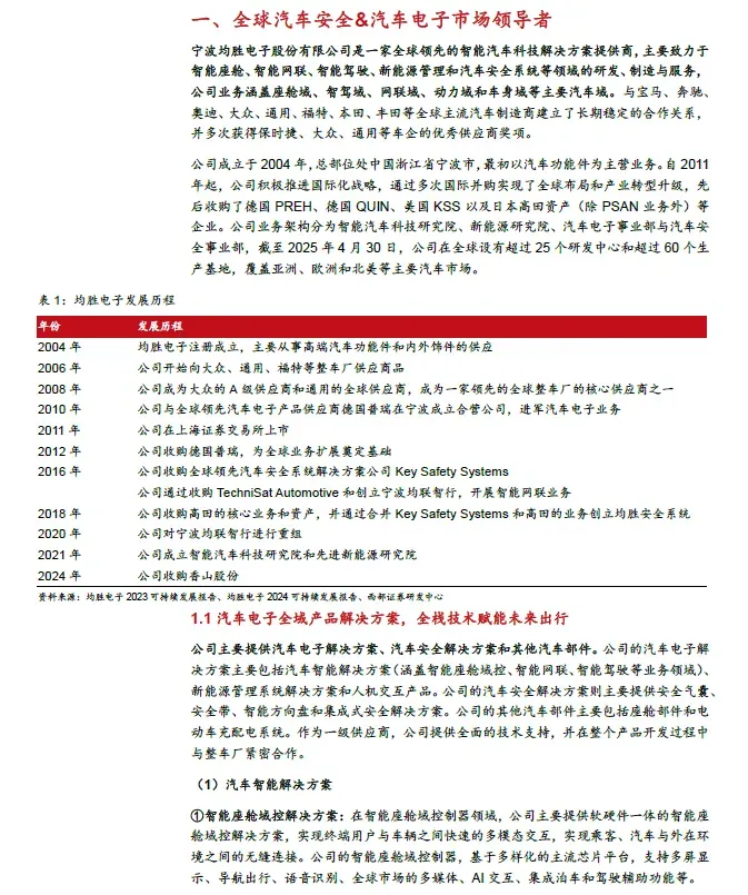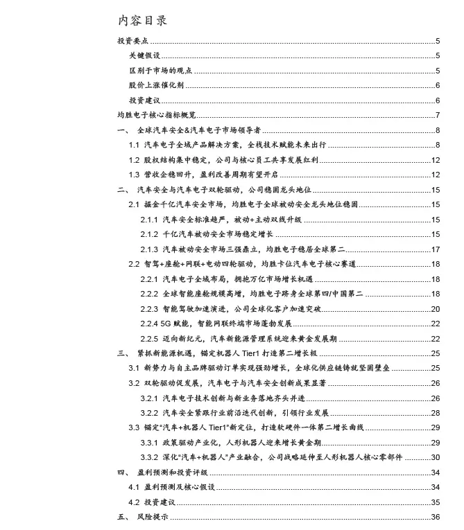 报告亮点:伴随汽车智能化深入推进,汽车安全及汽车电子的市场需求将持续扩容;同时均胜电子凭借领先的技术研发能力与全球化供应链体系,以及在和全球众多主流整车厂商具备稳固战略合作关系的基础上,未来有望汽车电子&安全领域的稳健增长和利润修复。同时公司打造机器人第二增长曲线,形成完善的产品矩阵体系,有望实现快速增长。
