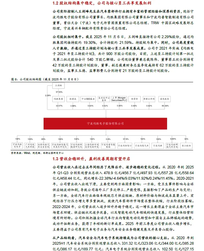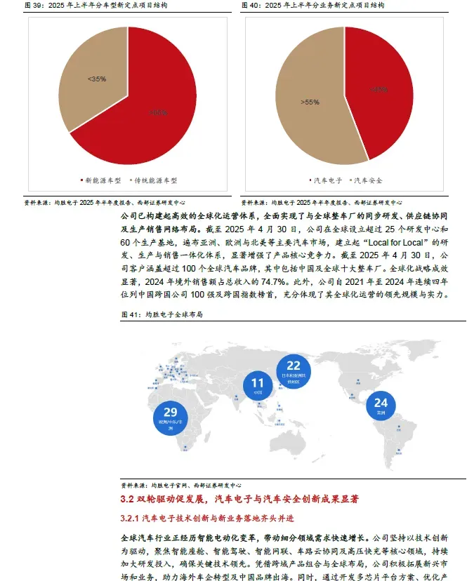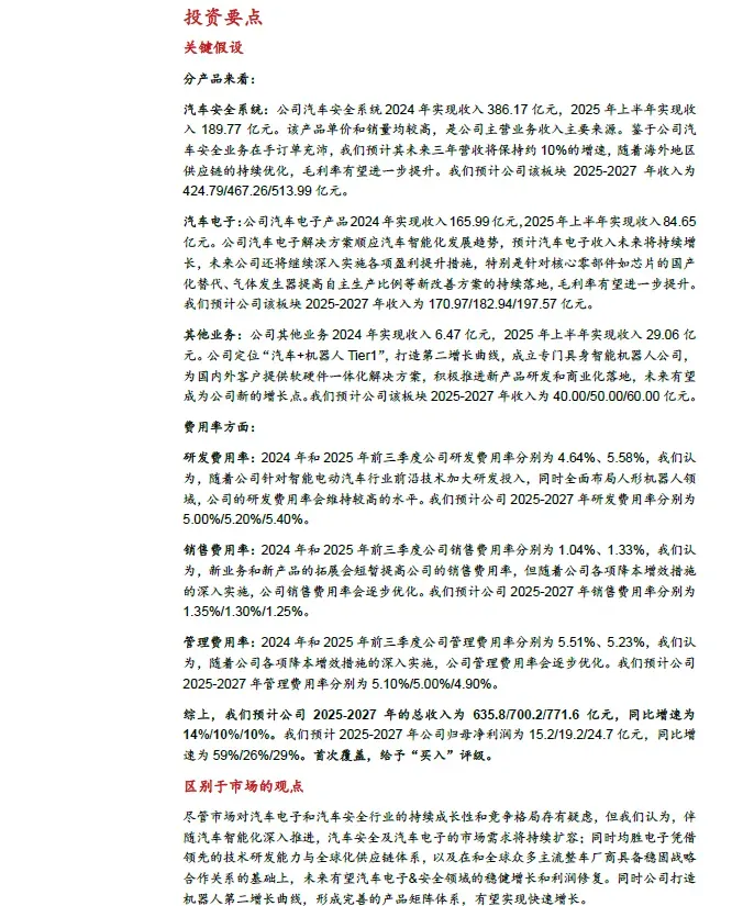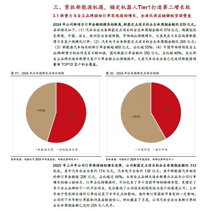 主要逻辑#1:公司在手订单有望保障未来收入&利润稳健增长。2025 年上半年公司新获定点项目的全生命周期金额约312 亿元,其中汽车安全业务约174 亿元,汽车电子业务约138 亿元;新能源汽车相关的新订单金额超206亿元。