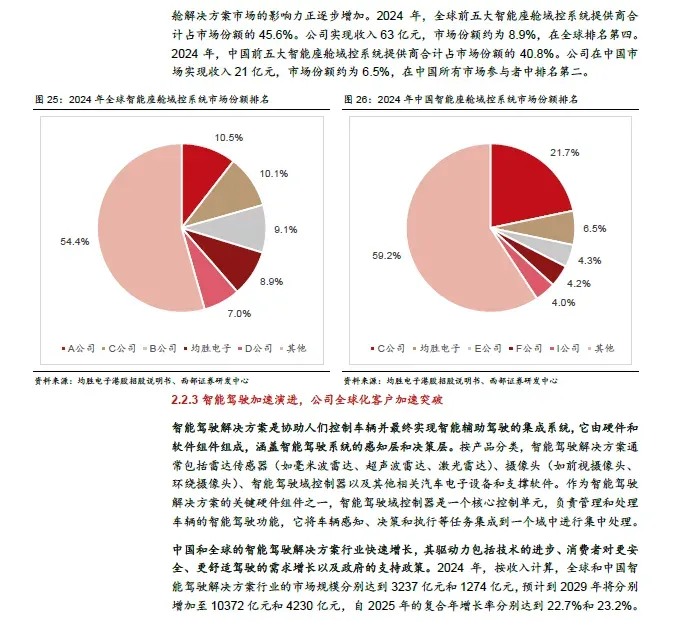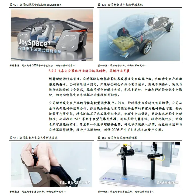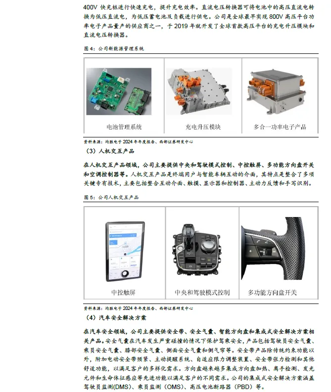 主要逻辑#2:公司汽车电子与汽车安全业务开启新一轮创新周期。(1)智能座舱领域:公司全球首发沉浸式智能座舱JoySpace+。(2)智能驾驶领域:公司与Momenta合作并获得超10 亿元高阶智能辅助驾驶域控项目定点。(3)智能网联、车路云协同领域:公司为全新国产宝马5 系量产V2X 解决方案。(4)新能源管理领域:公司启动1000V 及以上系统研发,新获多品牌订单。