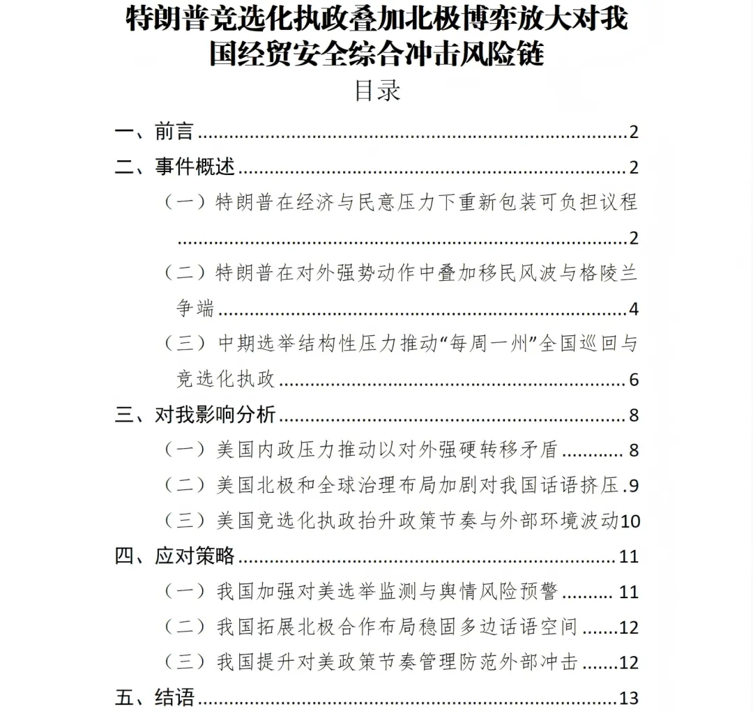 伴随委内瑞拉军事行动、移民执法升级及北极安全框架谈判推进,美方频繁动用关税、制裁和资源控制等工具塑造“外部竞争者”叙事,把国内民生焦虑外溢为对外强硬姿态。上述内外联动正在重塑美国政策节奏与风险偏好,对我国经贸安全、极地布局和多边治理空间形成叠加冲击,亟需从QB角度持续跟踪并前瞻研判。