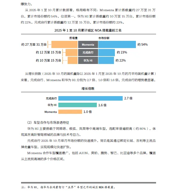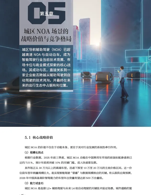 城区NOA(Navigation on Autopilot,即城区导航辅助驾驶)作为当下辅助驾驶的竞争主战场与能力试金石,已超越高速场景成为决定行业排位的核心指标。其前装渗透率在2025 年底预计突破10%,并正从高端市场快速下沉至10 万至20 万元主流价位区间。该场景的竞争,已演化为第三方供应商(形成“华元魔”三足鼎立格局)与车企自研体系之间,在技术、量产、成本与数据闭环能力上的全方位较量。