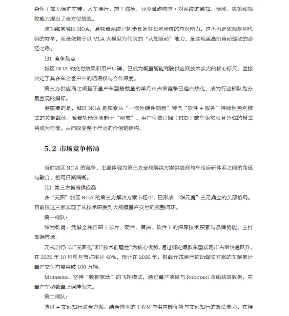 系统梳理智能驾驶技术的发展脉络与当前主流技术路线,重点解析以VLA 为代表的大模型带来的范式变革。深入分析城区NOA 等核心落地场景的战略价值与市场竞争格局,呈现“华元魔(华为、元戎启行、Momenta)”等头部玩家的差异化路径。客观探讨行业当前面临的商业化挑战与未来可能的盈利模式演进方向。为车企、供应商、投资者及政策制定者提供一份基于事实与逻辑的产业参考。