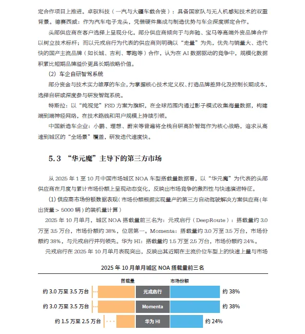 商业化进入“量”与“利”的攻坚期。行业已跨越从0 到1 的技术验证,进入从1 到N 的规模化交付阶段。头部供应商通过绑定走量车型实现市占率快速跃升(如元戎启行2025 年10 月单月市占率达40%)。然而,可持续的盈利模式仍是普遍挑战,行业共识在于必须从“一次性硬件销售”转向 “软件+ 服务”订阅,并探索未来基于自动驾驶的出行服务运营。
