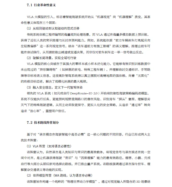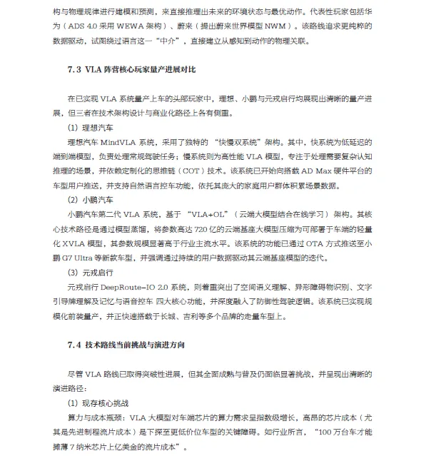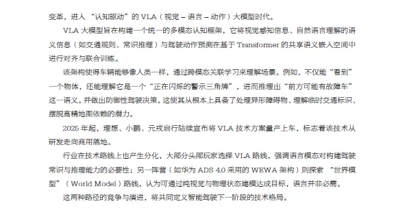 智能驾驶技术范式已发生根本性变革。行业正从依赖规则与高精地图的感知驱动,全面转向以视觉- 语言- 动作(VLA)大模型为代表的认知驱动新阶段。当前,VLA 路线(以理想、小鹏、元戎启行为代表)与世界模型路线(以华为、蔚来为代表)正并行演进,共同推动技术边界。