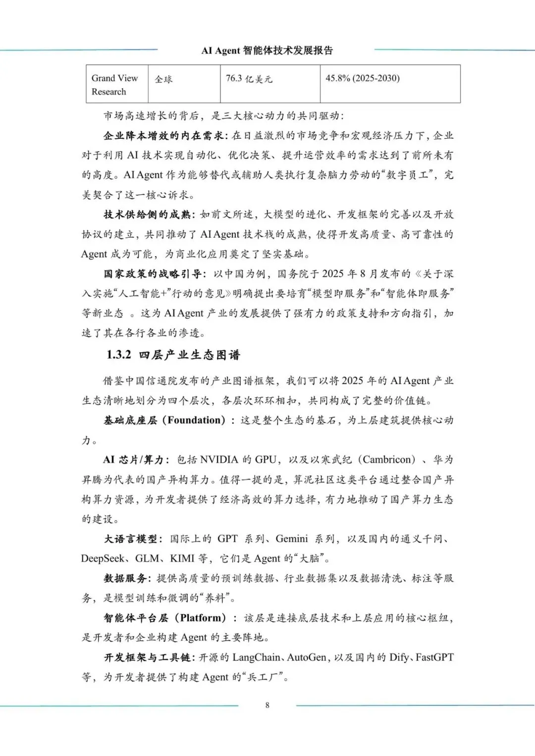 报告指出,AI Agent技术的突破主要源于基座大模型的持续进化、多智能体系统成为主流、开放协议与标准的建立,以及开发框架的日益成熟。这些进步共同推动了AI Agent从概念走向规模化应用。在产业层面,一个涵盖基础设施、模型层、平台层和应用层的千亿级市场生态正在形成,呈现出国内外企业百家争鸣的竞争格局。