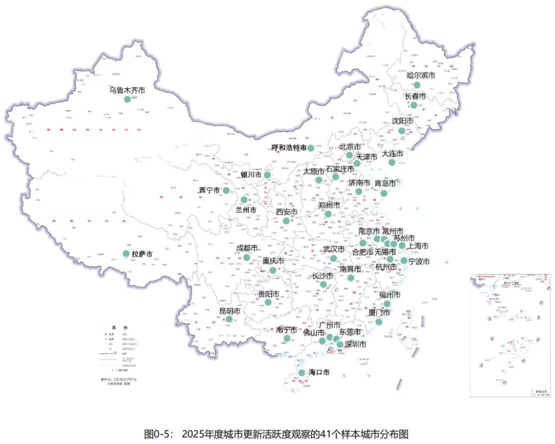 观察对象:41个超大、特大和I型大城市。本研究以第七次全国人口普查结果为参照,选取城区常住人口超过300万的35个超大、特大和Ⅰ型大城市和其他省会城市作为2025年度城市更新活跃度观察的样本城市。包括:上海、北京、深圳、重庆、广州、成都、天津、武汉、东莞、西安、杭州、佛山、南京、济南、沈阳、青岛、兰州、长沙、哈尔滨、郑州、昆明、大连、南宁、石家庄、厦门、太原、苏州、贵阳、合肥、乌鲁木齐、宁波、无锡、福州、长春、南昌、常州、海口、呼和浩特、银川、西宁、拉萨。