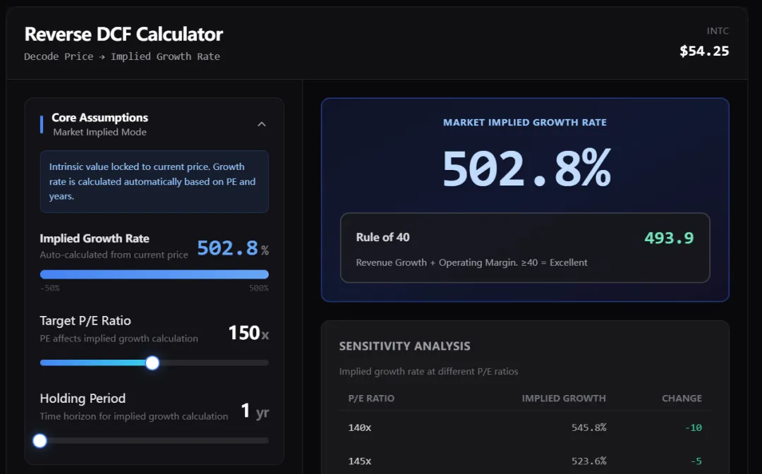 市场正在定价 Intel 未来的利润将增长 500% 以上。这意味着当前的股价透支了未来几年的完美执行。