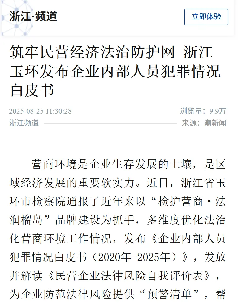 2019年,玉环市检察院首次编印《服务民营经济发展检察白皮书》,为企业健康发展提供了明确指引。2025年,该院再次发布《企业内部人员犯罪情况白皮书(2020-2025年)》,以典型案例深入剖析犯罪新态势,为企业识别风险、强化内控提供了务实参考,有力彰显检察机关护航企业发展的责任担当。