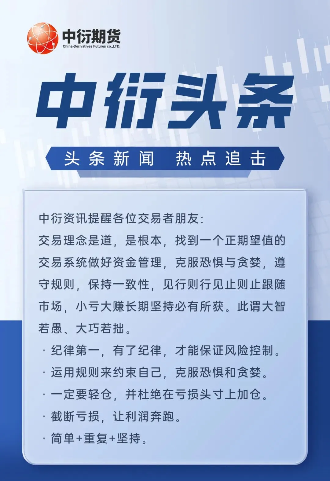 中衍期货有限公司具有中国证监会核准的期货投资咨询业务资格(批文号:证监许可[2012]1525号)。本公司报告/内容的观点和信息仅供中衍期货风险承受能力合适的签约客户参考。本报告/内容难以设置访问权限,若给您造成不便,敬请谅解。本公司不会因为关注、收到或阅读本报告内容而视其为客户;本报告/内容不构成具体业务或产品的推介,亦不应被视为相应期货和衍生品的交易建议,不应凭借本报告/内容进行具体操作。请您根据自身的风险承受能力自行做出交易决定并自主承担交易风险。