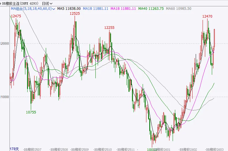 走势分析:BR橡胶近期回调企稳后震荡上行,后续偏强运行概率较大,下方支撑位参考11750附近,上方压力位参考12550附近。