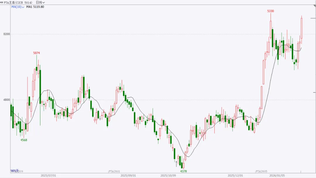 走势分析:2026年全年无PTA新产能计划,供应压力大幅减轻。下游聚酯产量预计保持增长,市场有去库预期。PTA后市或延续走强。