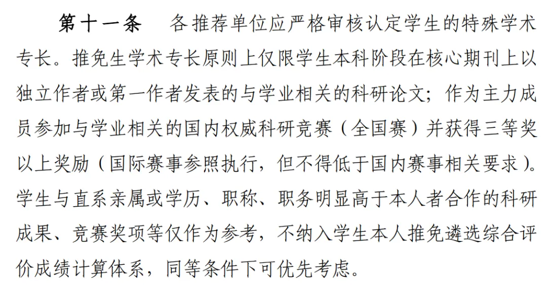 在推免生学术专长原则上仅限学生本科阶段在核心期刊上以独立作者或第一作者发表的与学业相关的科研论文。 作为主力成员参加与学业相关的国内权威科研竞赛(全国赛)并获得三等奖以上奖励。