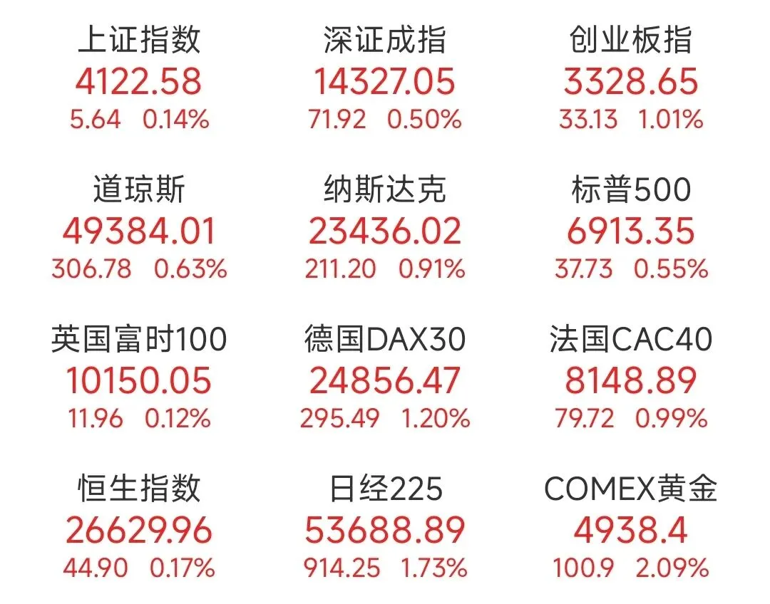 美股全线大涨:受美国经济数据好于预期(如GDP增长4.4%、初请失业金人数低于预期)以及地缘政治担忧缓解的提振,美股三大指数集体收涨。大型科技股普遍上扬,Meta 和 特斯拉 表现亮眼。