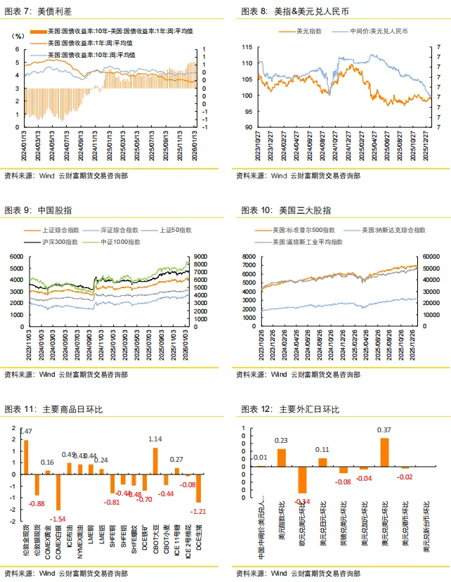 国内方面:央行行长潘功胜表示,2026 年将继续实施好适度宽松的货币政策,灵活高效运用降准降息等多种货币政策工具,保持流动性充裕。今年降准降息还有一定的空间。要继续维护好金融市场的平稳运行。做好预期管理,保持人民币汇率在合理均衡水平上的基本稳定。加强债券市场、外汇市场、货币市场、票据市场、黄金市场监督管理。建立在特定情景下向非银机构提供流动性的机制性安排。继续用好支持资本市场的两项货币政策工具,支持资本市场稳定发展。央行将于 1 月 23 日开展 9000 亿元 MLF 操作。鉴于 1 月有 2000 亿元 MLF到期,央行本次通过 MLF 操作净投放 7000 亿元,为连续 11 个月加量续作,且较上个月净投放规模 1000 亿元大幅增加。今年首批 936 亿元超长期特别国债支持设备更新资金已下达,支持工业、能源电力、教育、医疗、粮油加工、海关查验、住宅老旧电梯、节能降碳环保、回收循环利用等领域约 4500 个项目,将带动总投资超过 4600 亿元。国家统计局发布数据显示,不包含在校生,2025 年 12 月全国城镇 16-24 岁劳动力失业率为 16.5%,25-29 岁劳动力失业率为 6.9%,30-59 岁劳动力失业率为 3.9%。