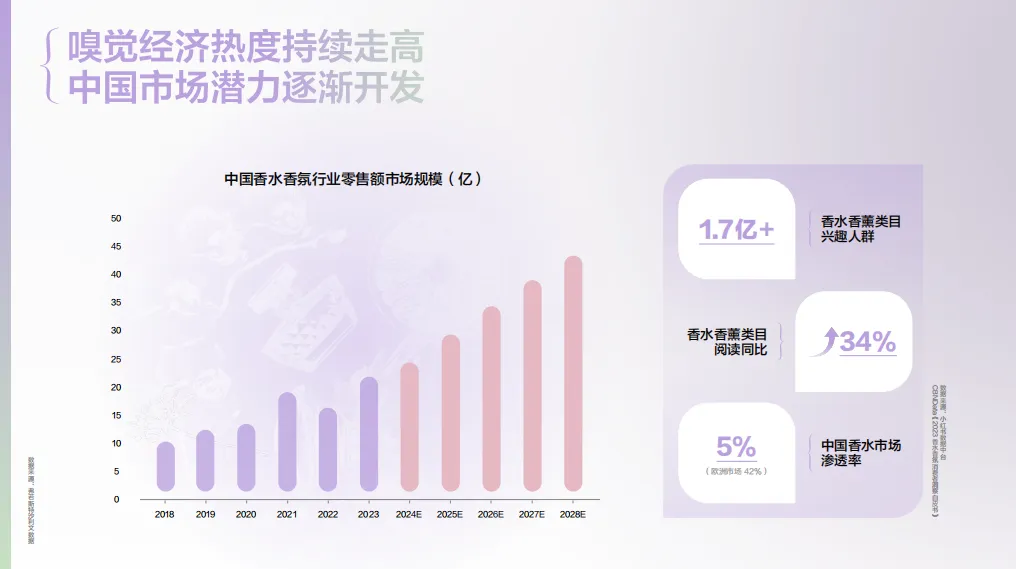 《2025香水香氛行业趋势灵感图鉴》精准捕捉行业新风向,为品牌破局提供关键指引。中国香水市场渗透率仅 5%,但兴趣人群超 1.7 亿,零售额持续攀升,嗅觉经济正迎来爆发式增长,成为美妆赛道新蓝海。