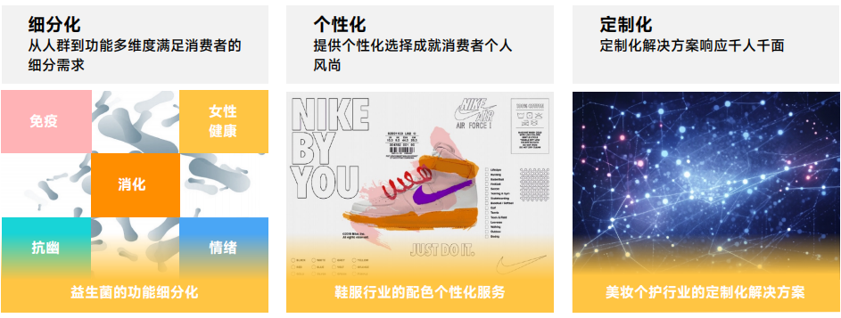 消费者的自我关注也驱动了行业端细分化需求的进一步迭代。在细分化的基础上,个性化服务也正在被越来越多的厂商所采用。如今的消费者更容易被适合自己及提升自我的产品所打动,在基础产品上提供部分个性化选择或搭载个性化模块可有助于提升产品体验,如鞋服行业兴起的配色个性化服务就是品牌成就消费者个人风尚的有益尝试。