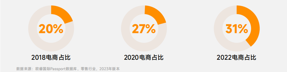 在中国,电商已经成为相对成熟的市场,渗透率显著高于全球平均水平。根据欧睿国际的研究显示,2018年中国电商的渗透率仅为20%,2020年中国电商的渗透率迅速提升至27%,2022年中国电商的渗透率迅速提升至27%。