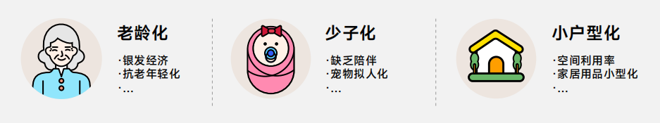 人口结构变化带来三点新机遇:老龄化带动“银发经济”和抗老年轻化;少子化和独居带动“宠物经济”;小户型化带动小而美的家居新潮流。老龄化的加剧增加“银发经济”的直接消费者,也推动中青年对衰老的恐惧,带动抗老需求,未来适老与抗老行业将迎来机遇;独居、少子的孤独感促使人们将宠物拟人化,更多的宠物及更高的投入意愿将促进“宠物经济”的升级;而小户型化则将进一步提高人们对空间利用率的追求。