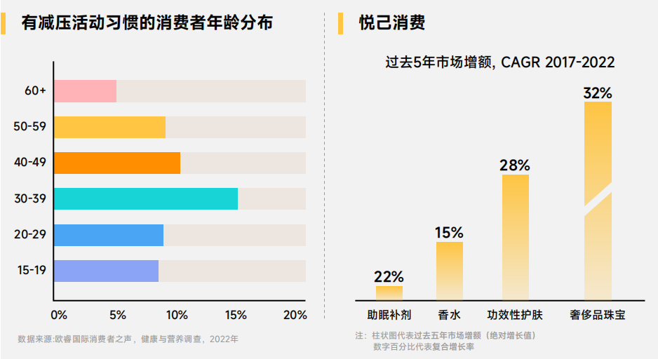 如今,消费者越来越关注从身体到精神上向内探索自我,消费行为愈加成为生活理念的践行和个人品位的呈现。健康需求、自我关爱、情绪价值等造就了空前强大的“悦己经济”市场。欧睿的消费者调研结果显示,中国消费者中有日常减压活动这一习惯的消费者逐年攀升,消费者的情绪问题需要释放的出口,人们选择消费小件“奢侈品”来进行自我犒赏,像香水这类能提供情绪价值的品类受益颇丰,2022年香水在抖音的搜索指数同比增长206%。
