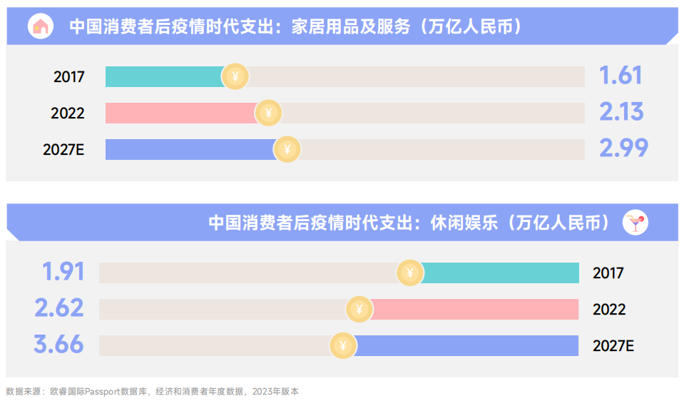 欧睿国际数据显示,中国消费者的家居用品及服务和休闲娱乐支出在后疫情时代将持续攀升,预计于2027年将分别达到近3万亿元和近4万亿元,相比十年前几乎翻了一番,体现出他们消费升级和消费重心转移的双重模式。