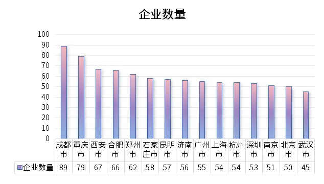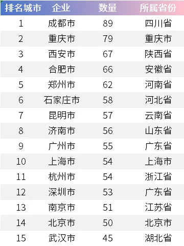 城市层面集中化程度更高,前15名城市企业数量占总数的32%,新一线城市表现突出。