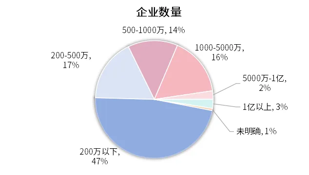 注册资本在200万元以下的企业数量最多,达到1327家,在所有明确注册资本区间中占比最高。200万元至500万元、500万元至 1000万元以及 1000万元至5000万元这三个区间的企业数量依次为485家、383家和 455家,合计占比也较大。