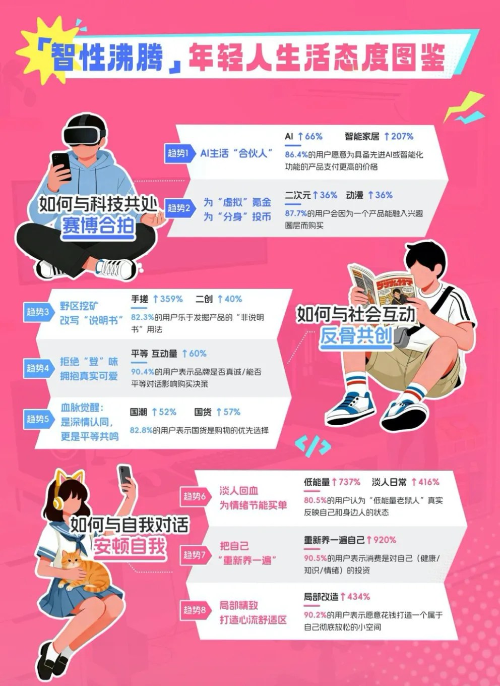 这是一代“智性沸腾”的年轻人一一用清醒的头脑做选择,为灵热的情感动真心。他们不是在消费,而是在用每一次支付,为自己认同的生活价值投票,为渴望的理想世界助力。