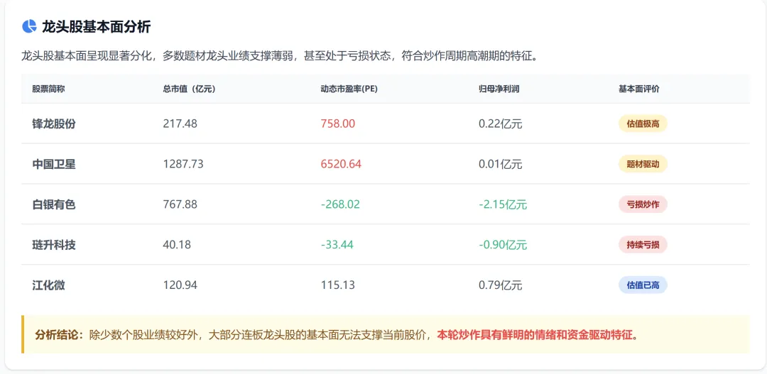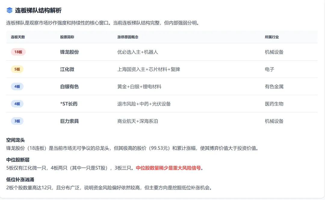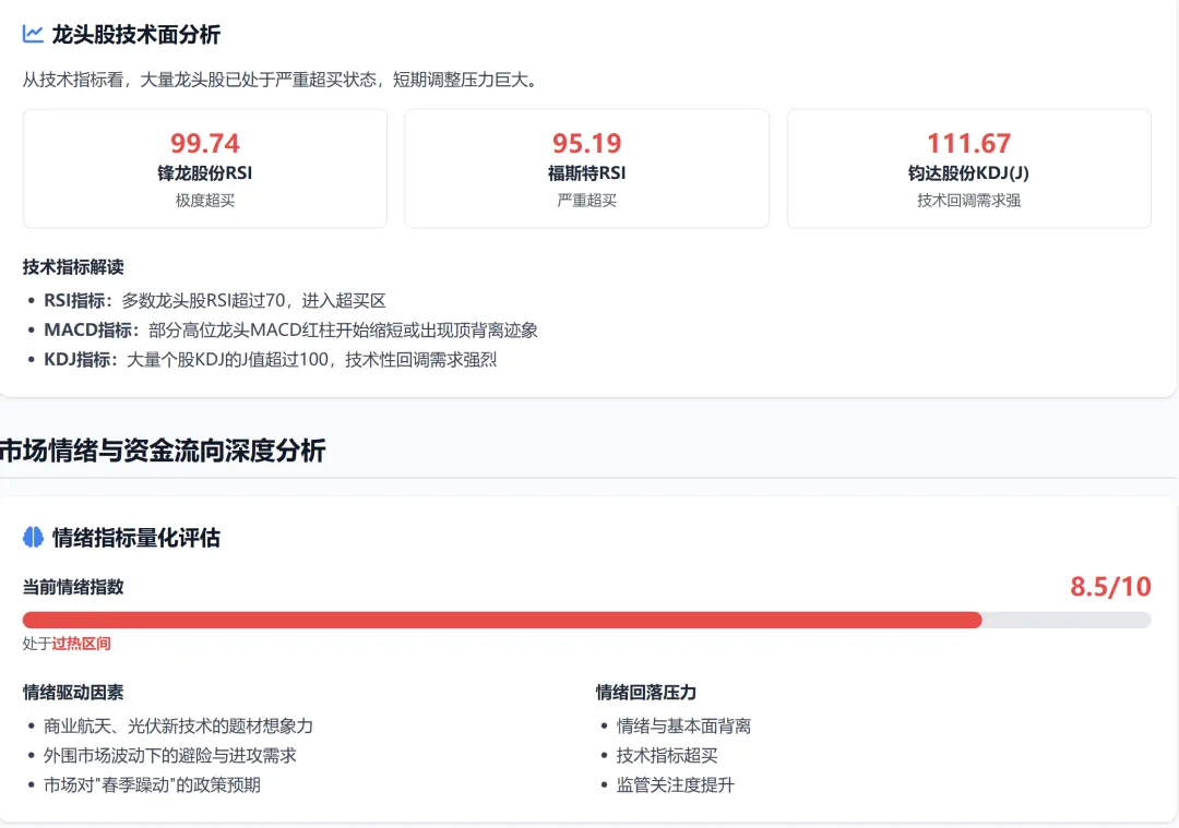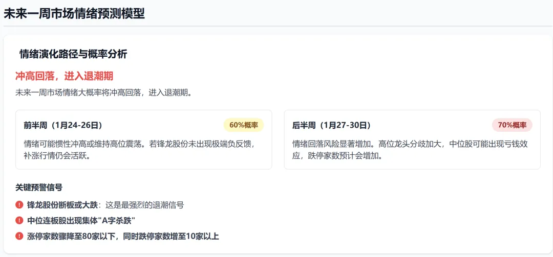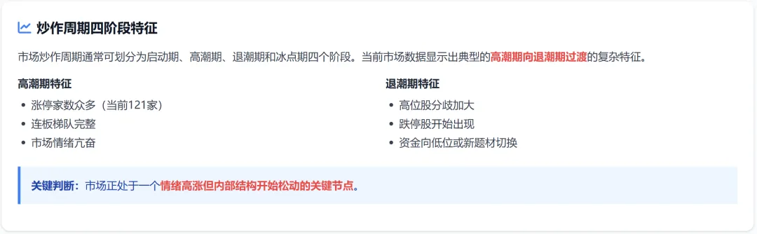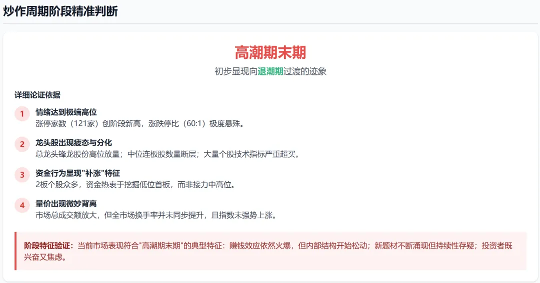 当前市场处于高潮期末期,情绪极度亢奋但内部结构开始松动。涨停家数创近期新高,但中位股断层、量价背离等信号预示退潮风险。