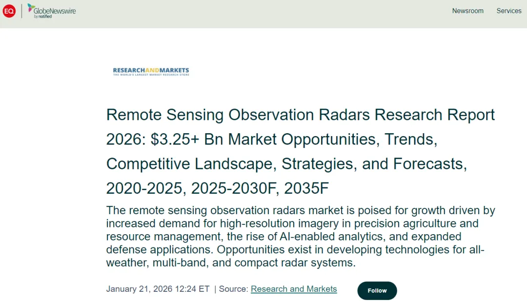 https://www.globenewswire.com/news-release/2026/01/21/3223142/0/en/Remote-Sensing-Observation-Radars-Research-Report-2026-3-25-Bn-Market-Opportunities-Trends-Competitive-Landscape-Strategies-and-Forecasts-2020-2025-2025-2030F-2035F.html