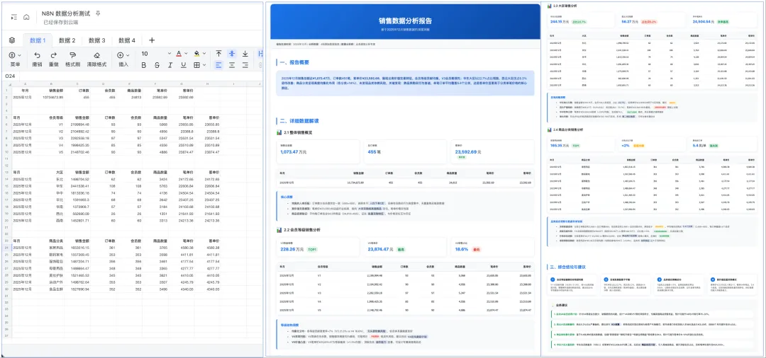 • 最佳场景:适用于需要生成定期报告的场景,如销售周报、活动数据复盘等。 • 复核建议:AI虽然强大,但其分析结果并非100%准确。建议您花少量时间对报告中的关键结论进行复核。