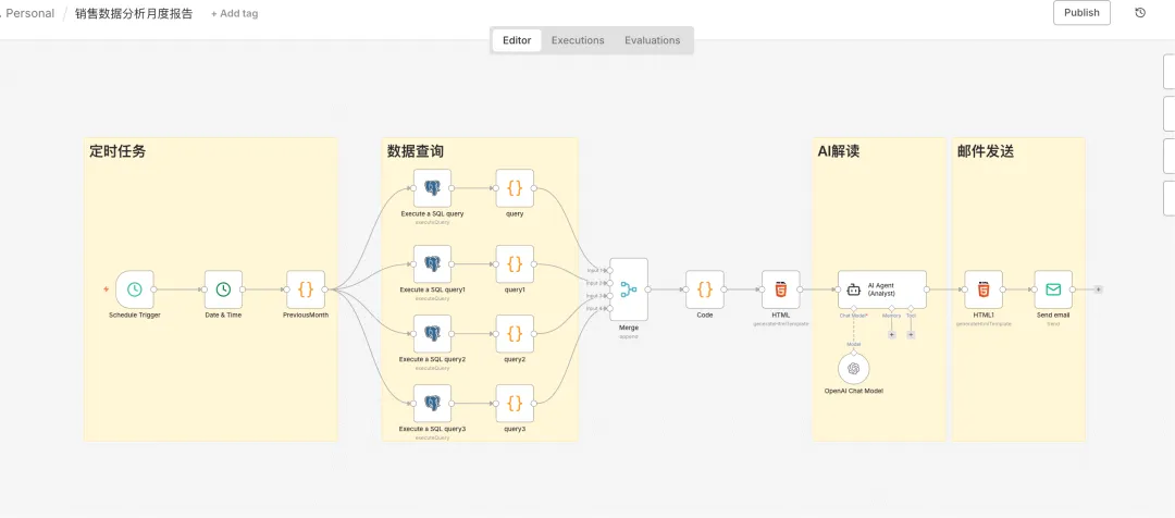 此前,我曾构建过一个基于n8n的自动化工作流。那个版本较为“硬核”——它能自动连接公司数据库,定时抓取数据,并由AI生成报告发送至邮箱。但该方案主要适用于拥有数据库、且熟悉SQL的技术团队。