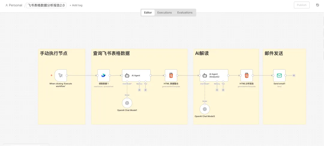 1. 更新数据:在飞书表格中更新本周数据(如销售、活动转化数据),随后在n8n中点击执行按钮。 2. 读取数据:工作流通过API自动抓取飞书表格中的最新数据。 3. AI深度解读:AI会像资深分析师一样,分析数据趋势、定位异常点,并提供洞察。 4. 邮件发送:一份排版美观、逻辑清晰的数据分析报告将自动发送到您的邮箱。