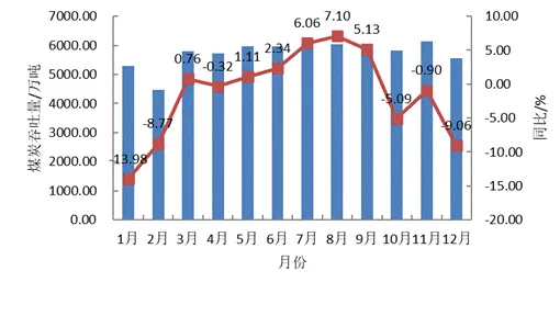 12月,中国港口协会统计的主要沿海内河港口企业累计完成煤炭吞吐量10945.00万吨,同比下降6.7%,其中累计完成外贸煤炭吞吐量1958.96万吨,同比增长5.5%。2025年1—12月,主要港口企业累计完成煤炭吞吐量129033.92万吨,同比下降3.3%,其中累计完成外贸煤炭吞吐量17154.91万吨,同比下降18.2%。12月,河北港口集团、天津港集团、国能黄骅港务、青岛港集团、日照港集团、连云港港口控股集团等北方主要煤炭下水港口企业累计完成煤炭吞吐量5552.12万吨,同比下降9.06%。2025年1—12月,上述主要煤炭下水港口企业累计完成煤炭吞吐量68809.41万吨,同比下降1.07%。2025年北方主要煤炭下水港口企业月度煤炭吞吐量及同比增速见图1。