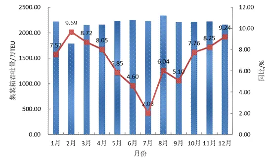 12月,中国港口协会统计的主要沿海内河港口企业累计完成集装箱吞吐量2628.34万TEU,同比增长9.2%,继续保持增长态势,其中累计完成外贸集装箱吞吐量1353.31万TEU,同比增长17.1%。2025年1—12月,主要港口企业累计完成集装箱吞吐量31839.86万TEU,同比增长7.3%,其中累计完成外贸集装箱吞吐量16225.79万TEU,同比增长11.2%。12月,大连港集团、天津港集团、青岛港集团、连云港港口控股集团、上港集团、宁波舟山港股份、厦门港务控股集团、广州港集团、深圳市港口企业、北部湾港股份、海南港航等11家沿海集装箱枢纽港港口企业累计完成集装箱吞吐量2161.88万TEU,同比增长9.24%。2025年1—12月,上述11家沿海集装箱枢纽港港口企业累计完成集装箱吞吐量26174.50万TEU,同比增长6.86%。2025年11家沿海集装箱枢纽港港口企业月度集装箱吞吐量及同比增速见图4。
