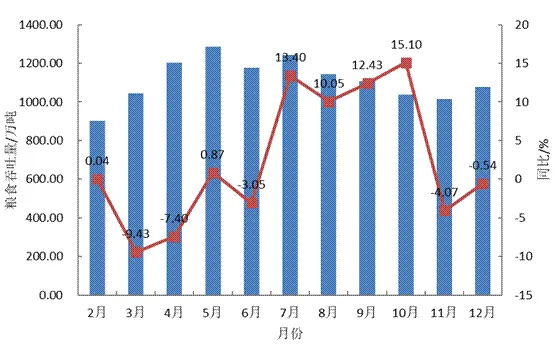 12月,中国港口协会统计的主要沿海内河港口企业累计完成粮食吞吐量1565.42万吨,同比增长2.2%,其中累计完成外贸粮食吞吐量608.46万吨,同比增长1.8%。2025年1—12月,主要港口企业累计完成粮食吞吐量18852.93万吨,同比增长5.1%,其中累计完成外贸粮食吞吐量8954.43万吨,同比下降6.1%。12月,大连港集团、营口港务集团、天津港集团、烟台港集团、青岛港集团、日照港集团、连云港港口控股集团、宁波舟山港股份、广州港集团、北部湾港股份等主要粮食接卸港口企业累计完成粮食吞吐量1077.54万吨,同比下降0.54%。2025年1—12月,上述主要粮食接卸港口企业累计完成粮食吞吐量13323.99万吨,同比下降0.05%。2025年主要粮食接卸港口企业月度粮食吞吐量及同比增速见图5。