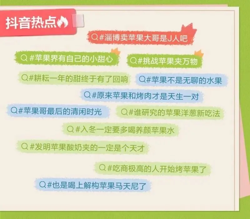 这个冬天,在抖音,苹果不再仅仅是“餐后水果”,而是从“果盘常客”摇身变为短视频中的“创意主角”。活动期间,#挑战苹果夹万物、#原来苹果和烤肉才是天生一对 等话题频登抖音热榜,引发广泛关注与讨论,更成功突破食用场景局限,成为冬日里的潮流符号。