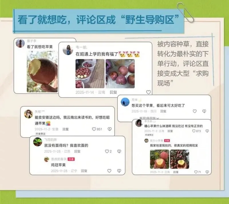这场从吃到玩的创意热潮,让苹果从简单的水果,转变为连接年轻人情感、激发分享欲的社交货币。随着热度的不断攀升,内容热传导至消费端,众多用户被内容种草,评论区在线“问品种”“求链接”,将线上热度切实转化为消费意愿。