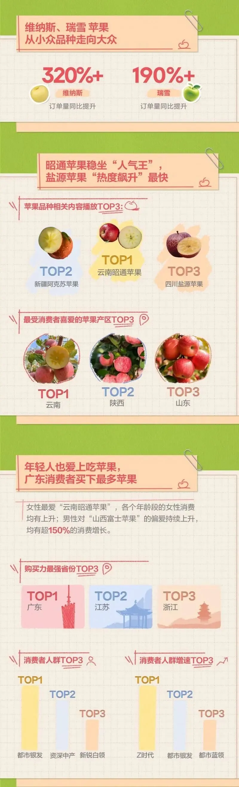 报告显示,云南昭通、新疆阿克苏、四川盐源三大产区苹果获得关注增长最快,昭通苹果更成为活动期间的“人气王”,洛川苹果与烟台苹果紧随其后。在人群偏好上,“云南昭通苹果”最受各年龄段女性青睐,消费同比持续上升,男性普遍喜欢“山西富士苹果”,各消费力人群购买增幅均超150%;Z世代、都市银发、资深中产等人群则展现出强劲消费力,成为核心购买力量。从省份消费情况看,广东、江苏、浙江位列前三。值得一提的是,维纳斯、瑞雪等以往相对小众的品类,也借此热度被更多消费者看见和选择,为市场带来了更丰富的口味。