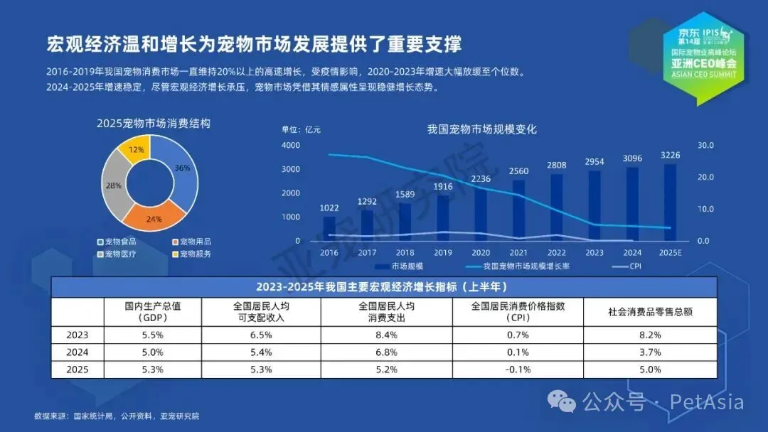 2016至2019年,中国宠物消费市场年增速超20%,疫情后增速放缓至个位数,2024至2025年增速稳定,市场规模预计达3226亿元,宠物食品、用品、服务各领域持续增长。