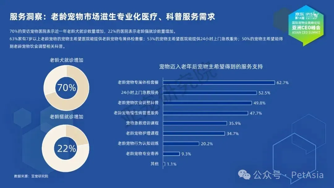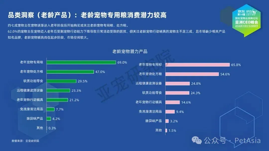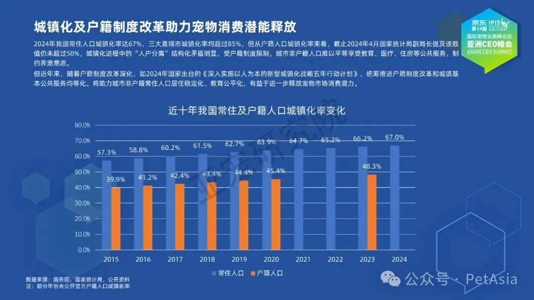 城镇化及户籍制度改革推动宠物消费潜力释放,2024年常住人口城镇化率67%,但户籍人口城镇化率仍不足50%。养宠数量低速攀升,犬猫活体数量预计增至1.87亿只,宠物老龄化趋势放缓,老龄宠物市场发展空间大。