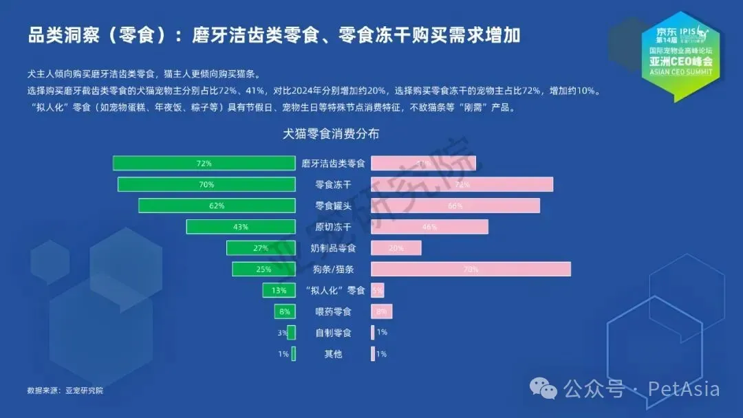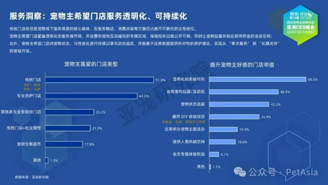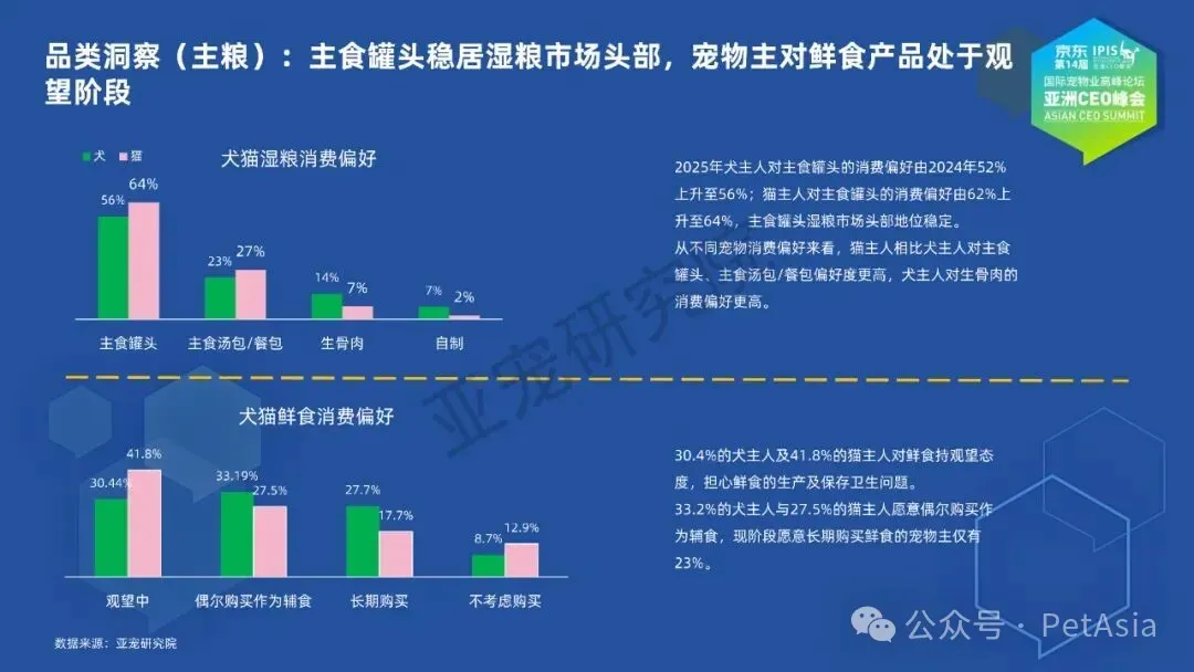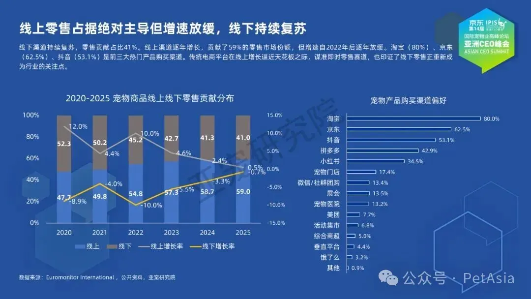 宠物主以女性、18至30岁青年轻群体为主,尽管收入收紧,但54%的宠物主表示会增加养宠消费。二线及以下城市养宠人群占比增至65%,市场进一步下沉。线上零售占主导但增速放缓,线下渠道持续复苏。