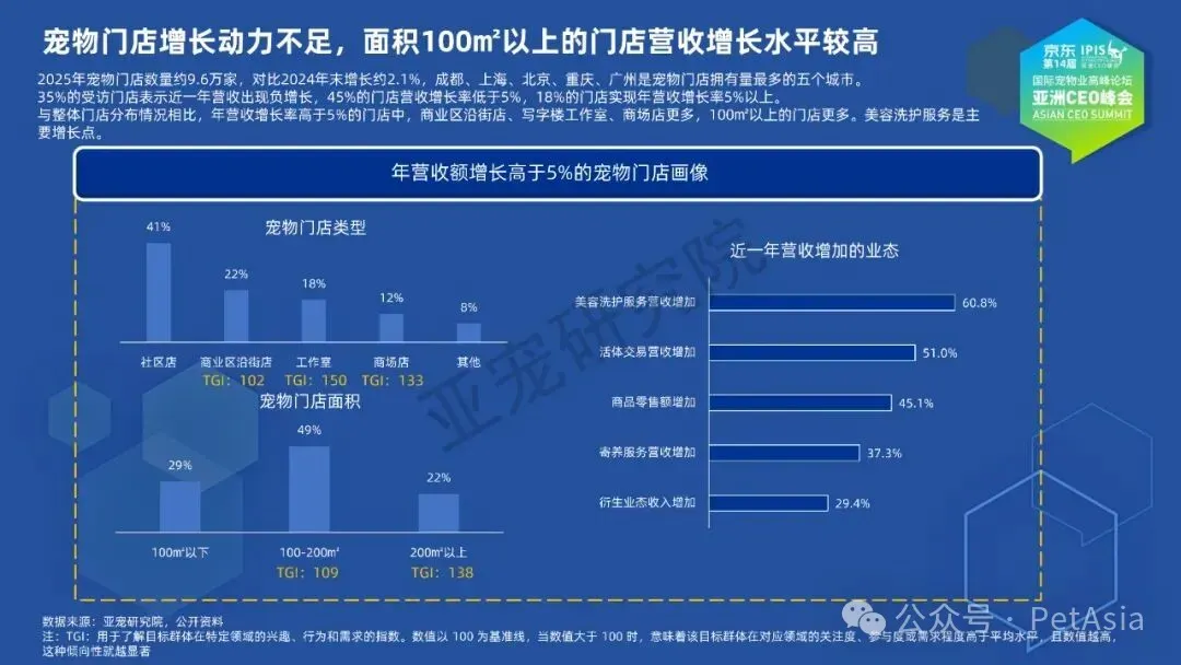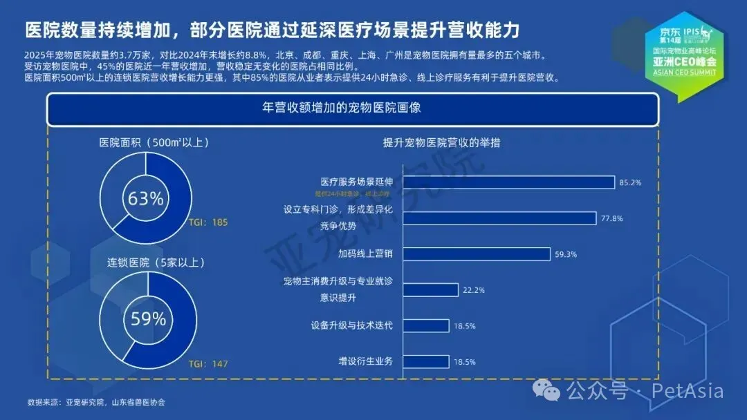 宠物门店数量增长乏力,年营收增长率高于5%的门店多为商业区沿街店、写字楼工作室、商场店,且面积多在100平方米以上。宠物医院数量持续增加,部分医院通过延深医疗场景提升营收能力。