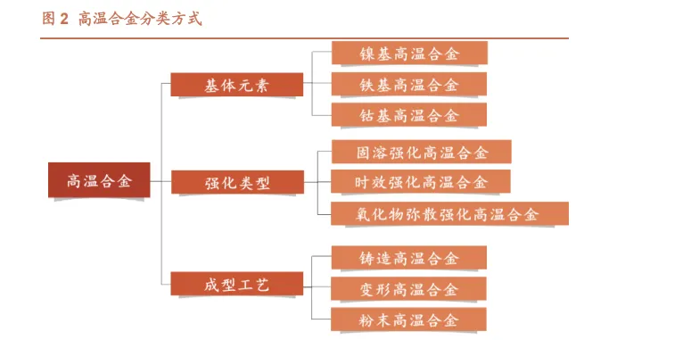 自高温合金诞生以来,伴随工艺及材料的不断进步,高温合金产品不断迭代,承温能力逐渐提高,综合性能不断增强。根据合金基体元素、成型工艺、强化类型的不同,高温合金可被划分为多种类型。