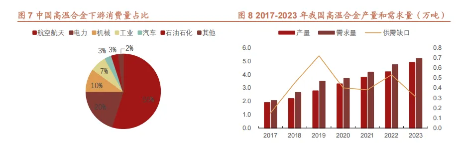 近年来伴随下游航空航天等领域快速发展,我国高温合金需求不断增加。智研咨询数据显示,2017-2023 年我国高温合金产量和需求量分别由约 1.9 万吨、2.1万吨增长至约 4.9 万吨、5.2 万吨,对应 CAGR 分别为 17.1%和 16.8%;在快速增长的同时供需缺口逐步收窄,对外依存度下降。中商情报网预计,2024 年我国高温合金产量可达 5.7 万吨,同比增长 16.3%。分领域来看,当前航空航天和电力是高温合金的主要应用领域,对应消费量占比分别为 55%和 20%。
