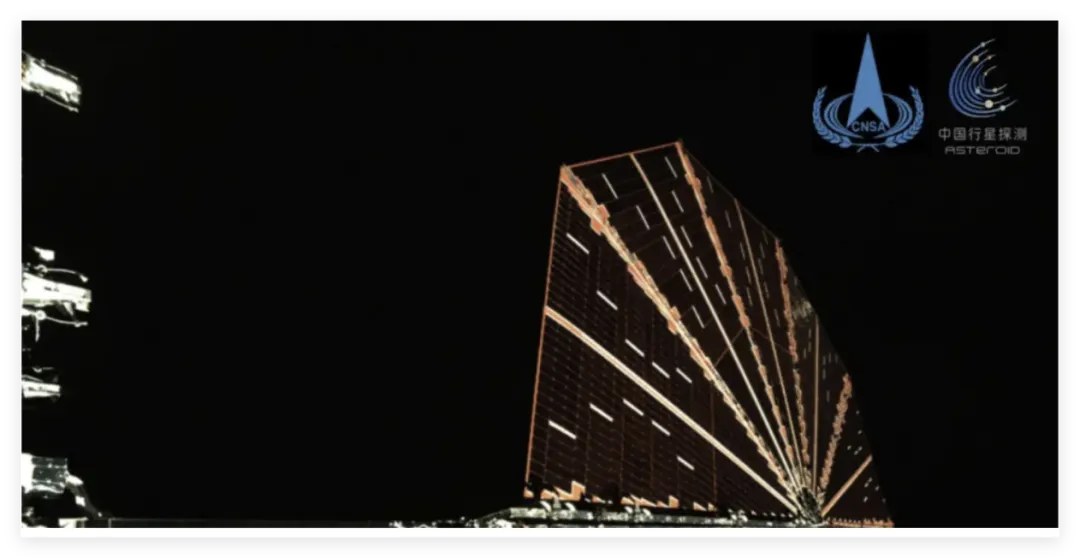 国家航天局发布的“天问二号”探测器在轨飞行正常圆形柔性太阳翼展开图片: