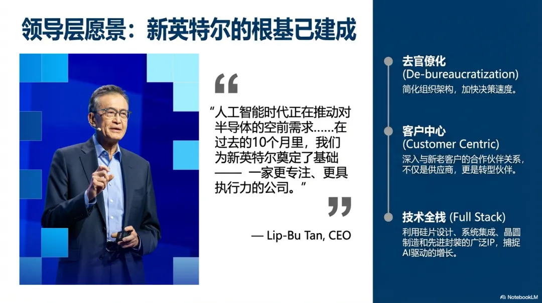 英特尔 CEO Lip-Bu Tan 的开场,典型而明确:2025 年是“为新英特尔奠定基础的一年”。 随后,他给出了几个具象的“动作”——精简组织、减少官僚、引入外部领导者、强化资产负债表,并用“客户与合作伙伴看到进展、希望英特尔参与其转型”来证明市场正在重新买账。